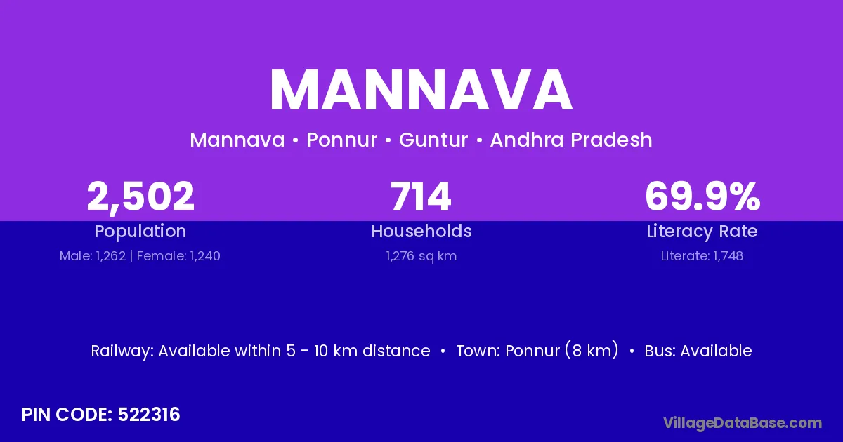 Ponnur (8 km) is the nearest town to Mannava village for major economic activities and is located approximately 8 km away.