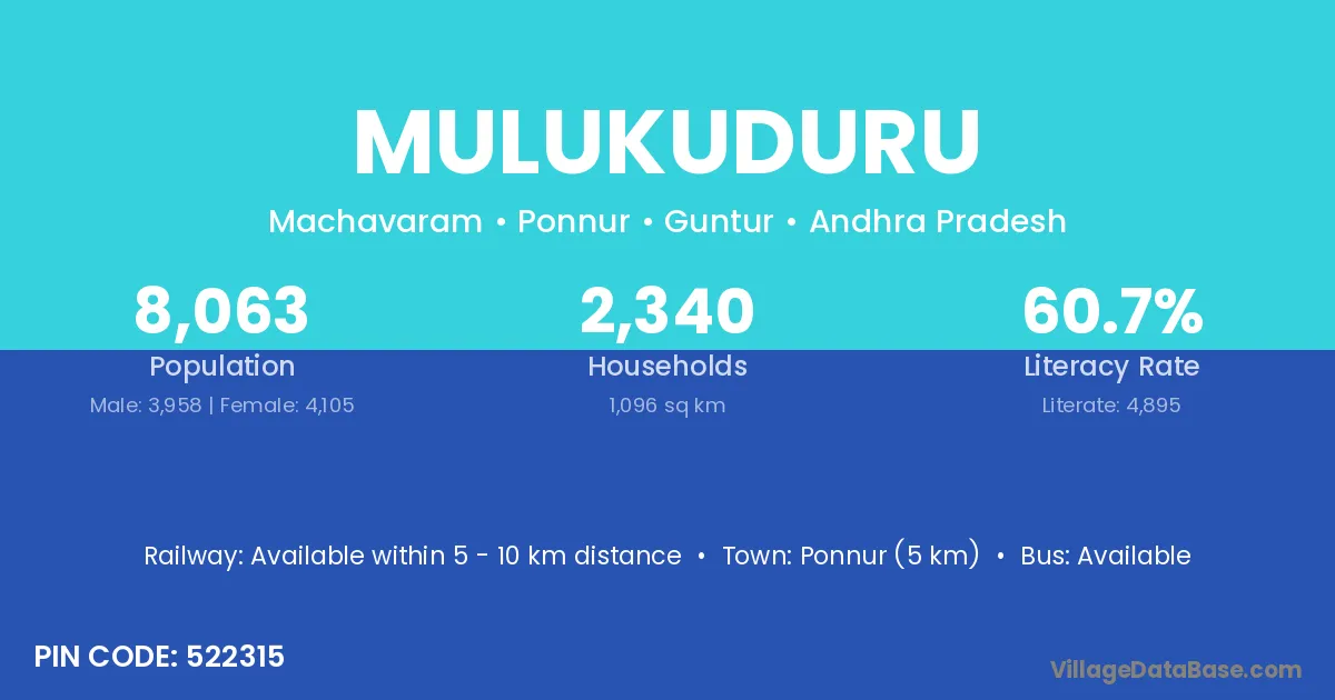 Ponnur (5 km) is the nearest town to Mulukuduru village for major economic activities and is located approximately 5 km away.