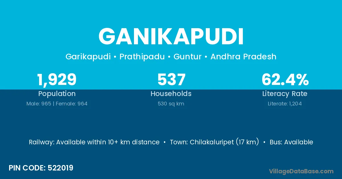 Chilakaluripet (17 km) is the nearest town to Ganikapudi village for major economic activities and is located approximately 17 km away.