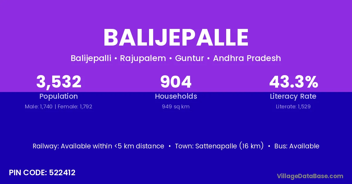 Sattenapalle (16 km) is the nearest town to Balijepalle village for major economic activities and is located approximately 16 km away.