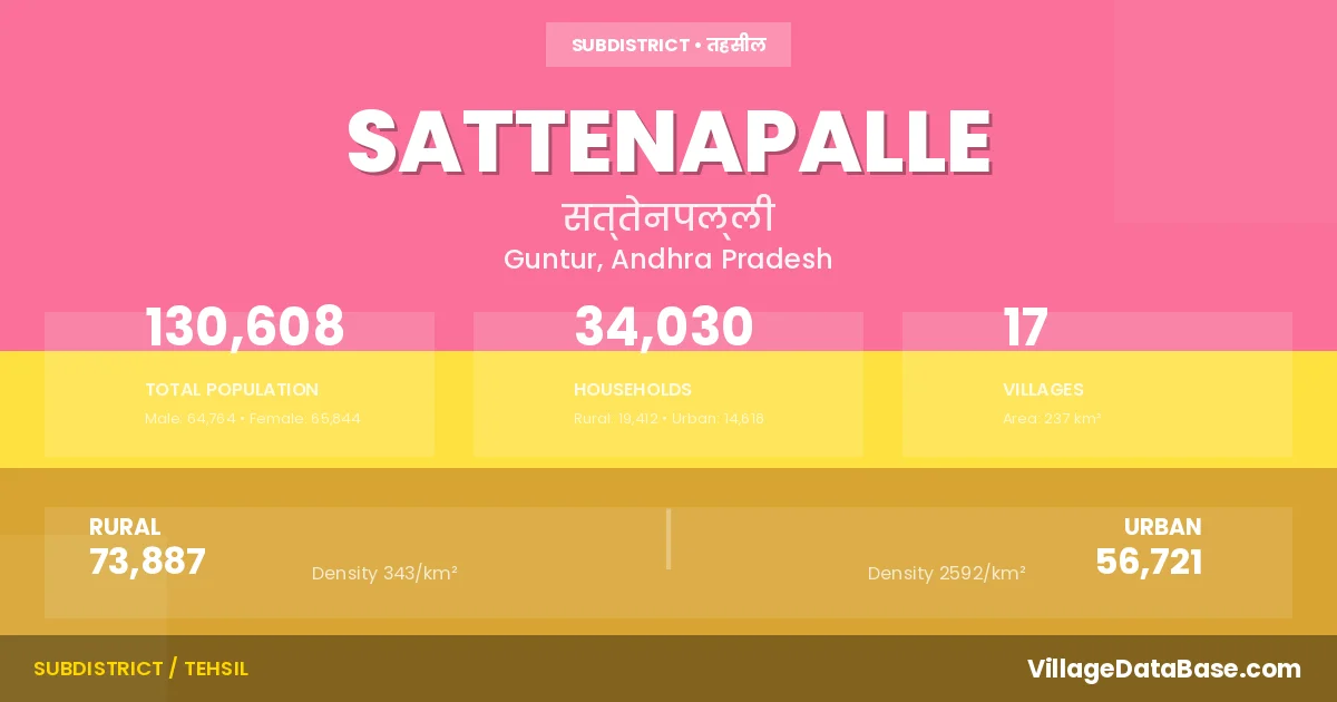 According to the 2011 census The total area of Sattenapalle Mandal is 237 km², with a population of 130608 people. The population density is 551 inhabitants per square kilometre, and there are approximately 34030 houses in the sub district.
