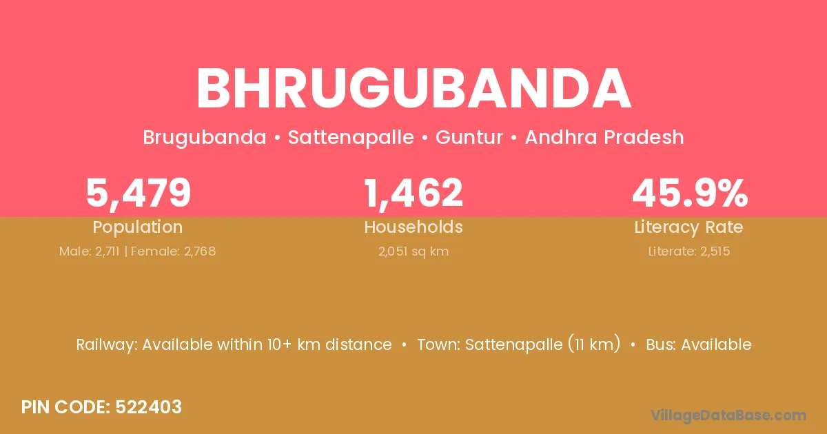 Sattenapalle (11 km) is the nearest town to Bhrugubanda village for major economic activities and is located approximately 11 km away.