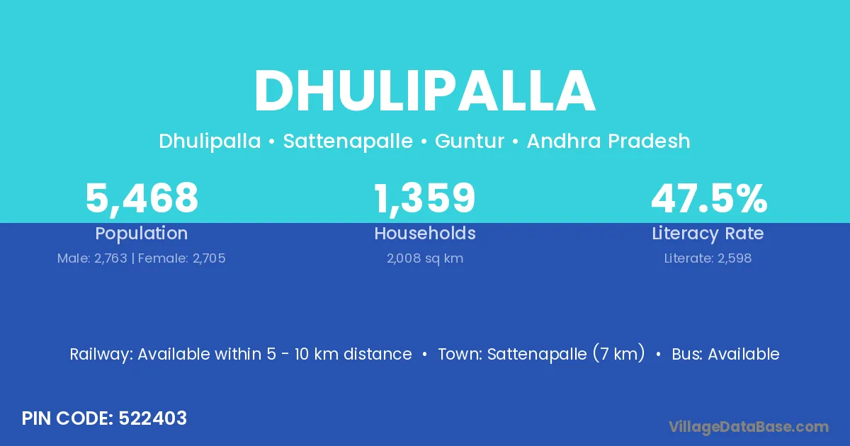 Sattenapalle (7 km) is the nearest town to Dhulipalla village for major economic activities and is located approximately 7 km away.