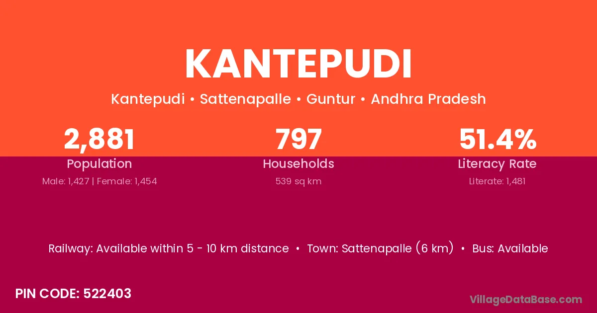 Sattenapalle (6 km) is the nearest town to Kantepudi village for major economic activities and is located approximately 6 km away.