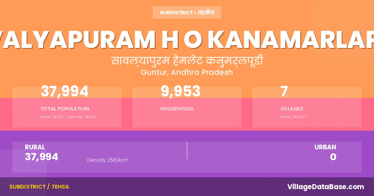 According to the 2011 census The total area of Savalyapuram H O Kanamarlapudi Mandal is 147 km², with a population of 37994 people. The population density is 258 inhabitants per square kilometre, and there are approximately 9953 houses in the sub district.