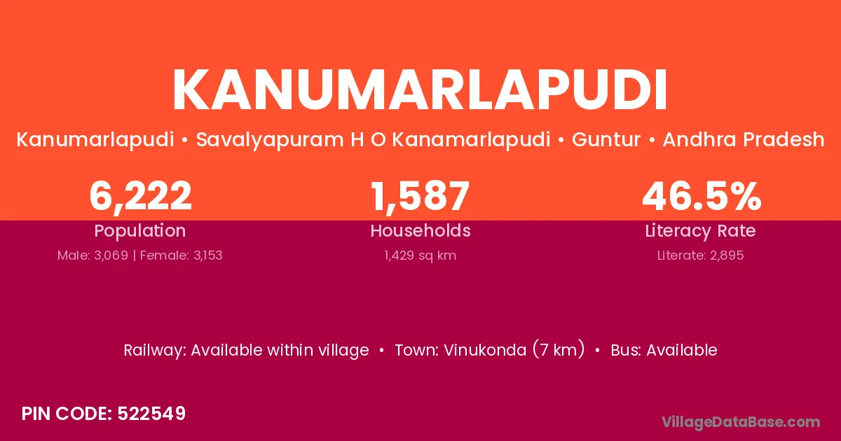 Vinukonda (7 km) is the nearest town to Kanumarlapudi village for major economic activities and is located approximately 7 km away.