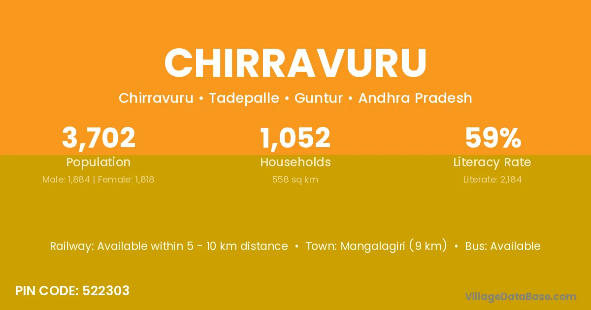 Mangalagiri (9 km) is the nearest town to Chirravuru village for major economic activities and is located approximately 9 km away.