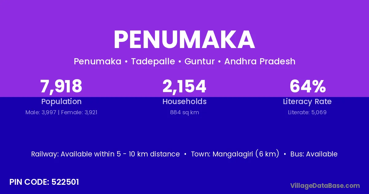 Mangalagiri (6 km) is the nearest town to Penumaka village for major economic activities and is located approximately 6 km away.