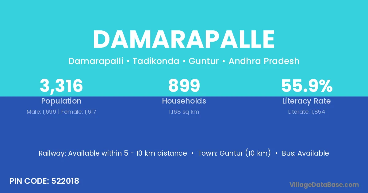 Guntur (10 km) is the nearest town to Damarapalle village for major economic activities and is located approximately 10 km away.