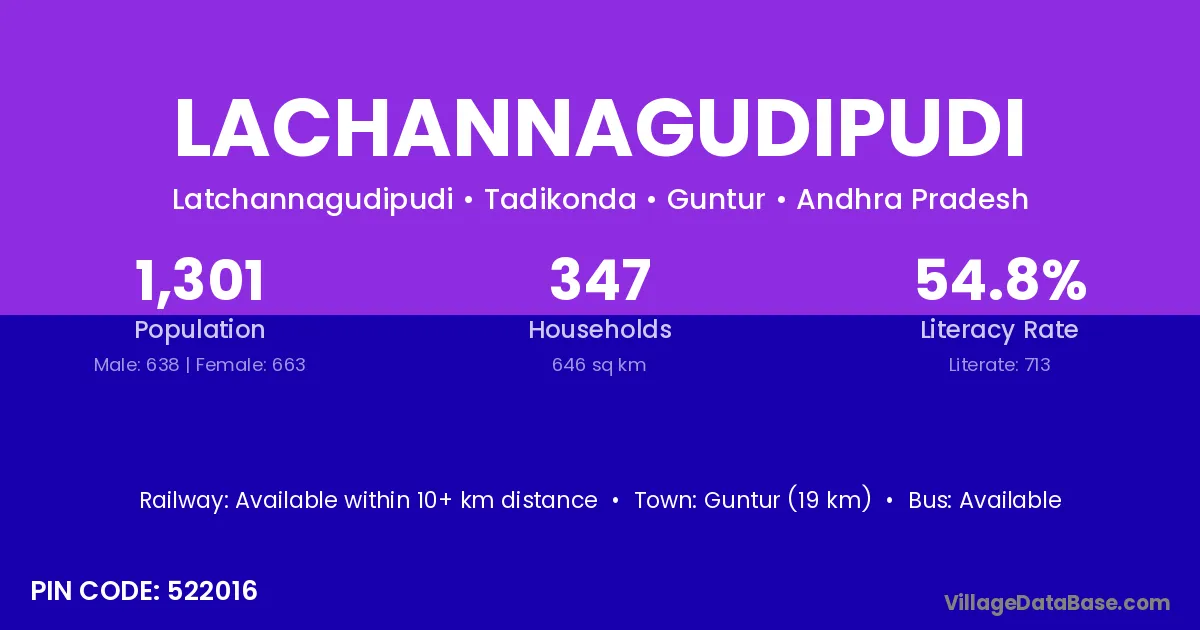 Lachannagudipudi village has a total population of 1,301 people, of which 638 are males and 663 are females.