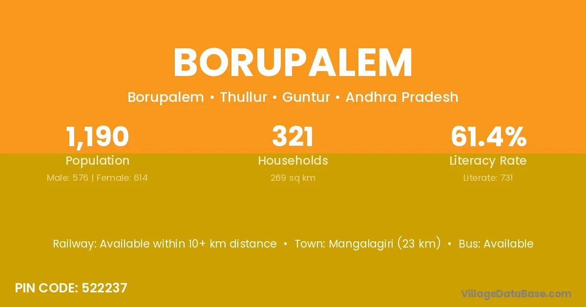 Mangalagiri (23 km) is the nearest town to Borupalem village for major economic activities and is located approximately 23 km away.