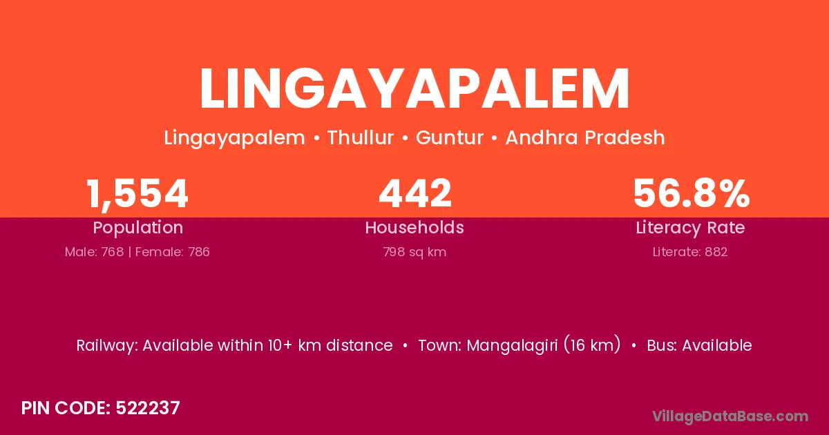 Mangalagiri (16 km) is the nearest town to Lingayapalem village for major economic activities and is located approximately 16 km away.