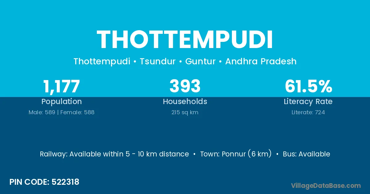 Ponnur (6 km) is the nearest town to Thottempudi village for major economic activities and is located approximately 6 km away.