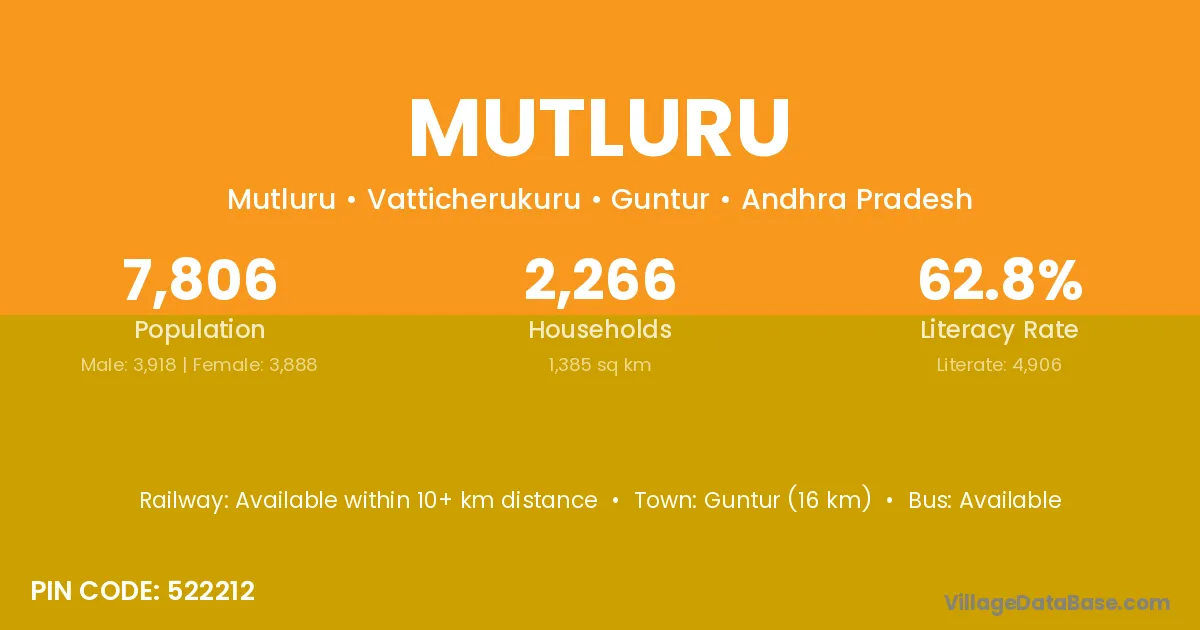Mutluru village has a total population of 7,806 people, of which 3,918 are males and 3,888 are females.
