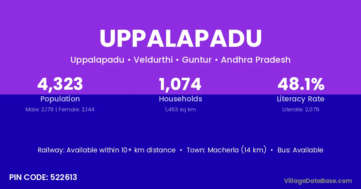 Uppalapadu village has a total population of 4,323 people, of which 2,179 are males and 2,144 are females.