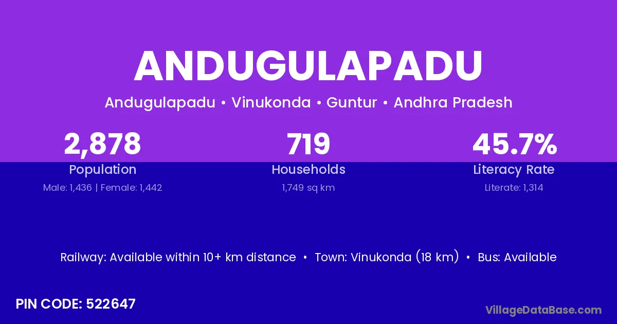 Vinukonda (18 km) is the nearest town to Andugulapadu village for major economic activities and is located approximately 18 km away.