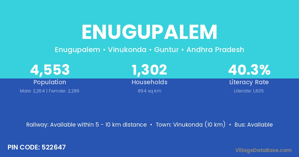 Vinukonda (10 km) is the nearest town to Enugupalem village for major economic activities and is located approximately 10 km away.