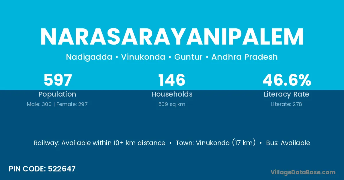 Vinukonda (17 km) is the nearest town to Narasarayanipalem village for major economic activities and is located approximately 17 km away.
