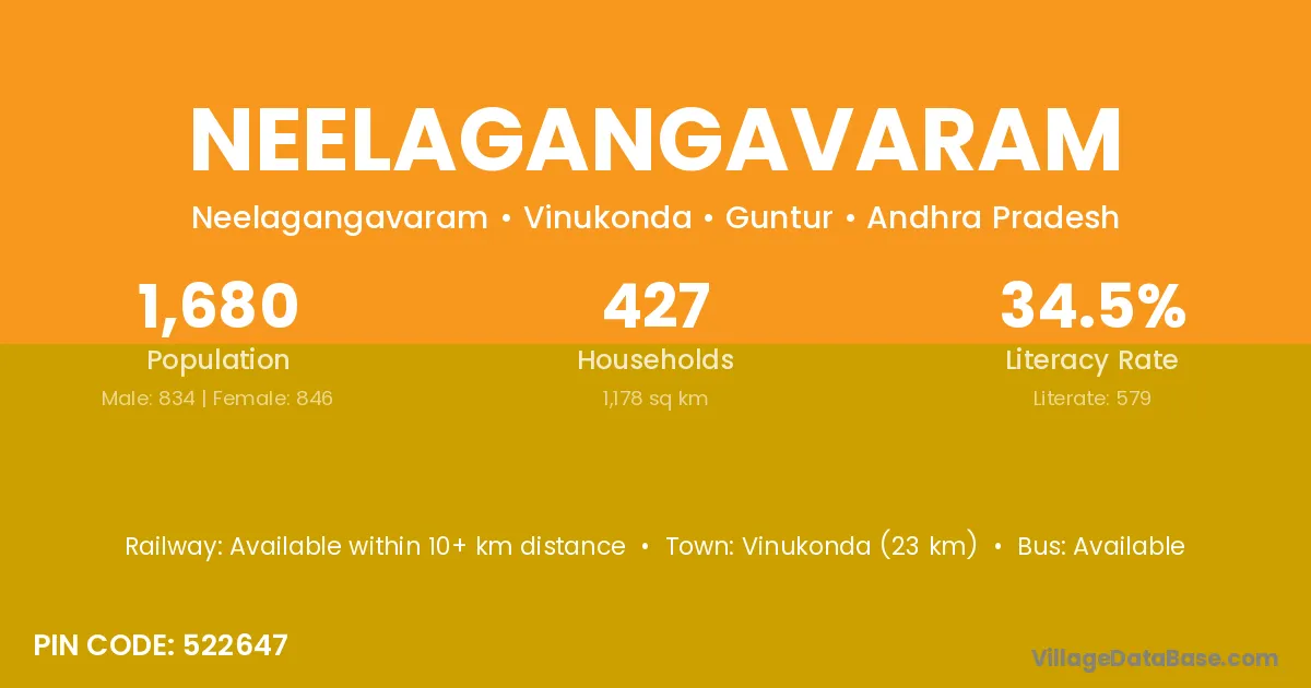 Vinukonda (23 km) is the nearest town to Neelagangavaram village for major economic activities and is located approximately 23 km away.
