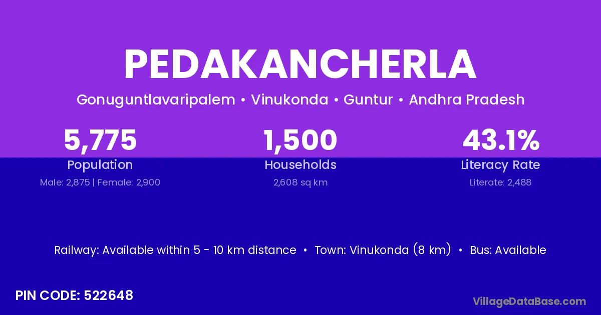 Vinukonda (8 km) is the nearest town to Pedakancherla village for major economic activities and is located approximately 8 km away.