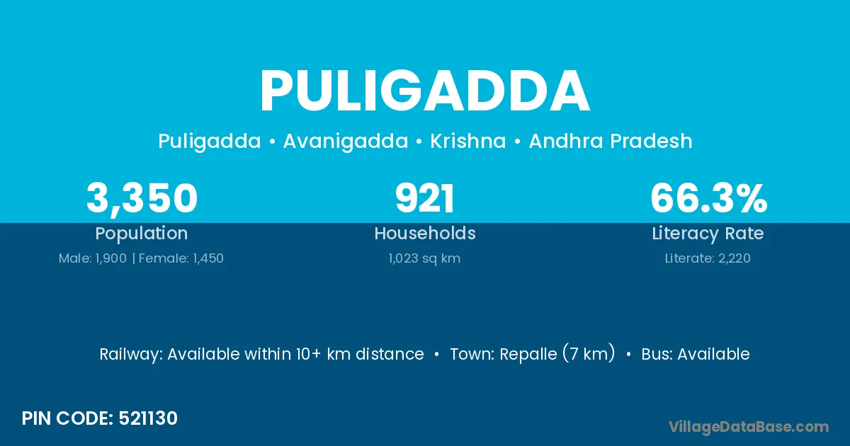 Repalle (7 km) is the nearest town to Puligadda village for major economic activities and is located approximately 7 km away.