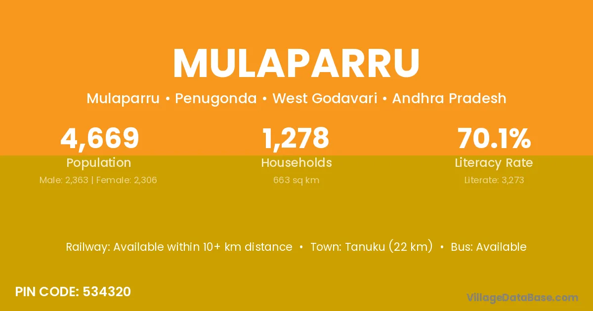 The literacy rate of Mulaparru village is 60.65%. Male literacy stands at 65.31% and female literacy at 56.01%.