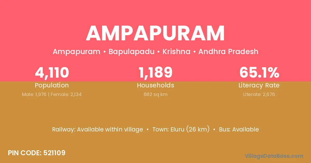 Ampapuram village has a total population of 4,110 people, of which 1,976 are males and 2,134 are females.