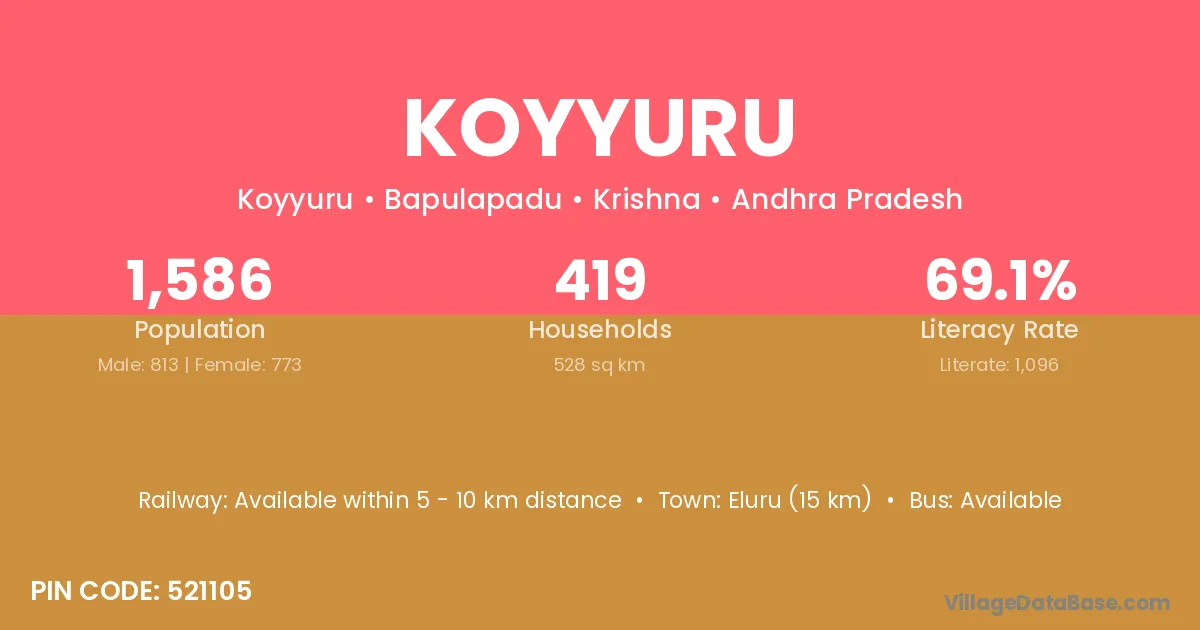 Koyyuru village has a total population of 1,586 people, of which 813 are males and 773 are females.