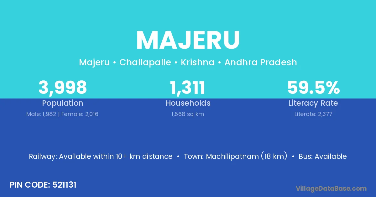 Machilipatnam (18 km) is the nearest town to Majeru village for major economic activities and is located approximately 18 km away.