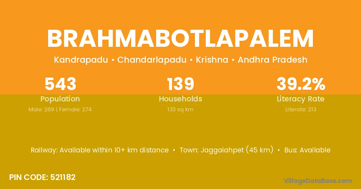Jaggaiahpet (45 km) is the nearest town to Brahmabotlapalem village for major economic activities and is located approximately 45 km away.