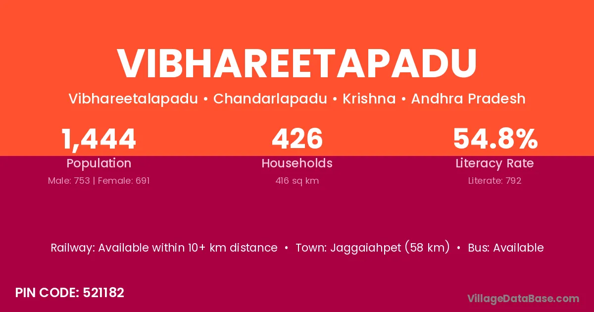 Jaggaiahpet (58 km) is the nearest town to Vibhareetapadu village for major economic activities and is located approximately 58 km away.