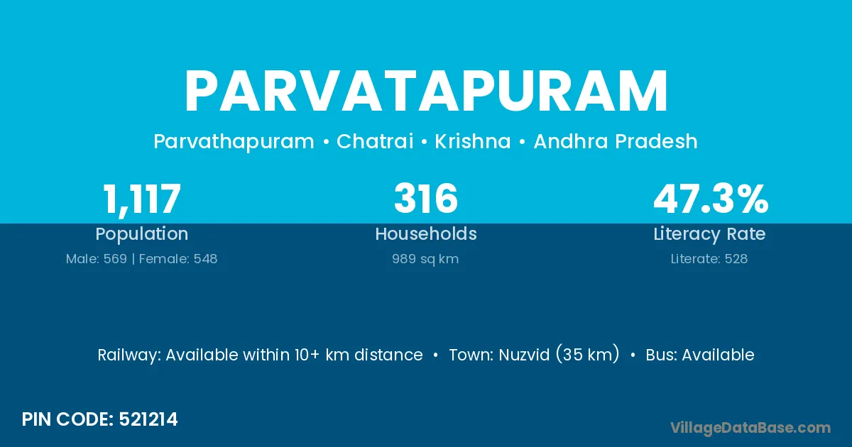 Nuzvid (35 km) is the nearest town to Parvatapuram village for major economic activities and is located approximately 35 km away.