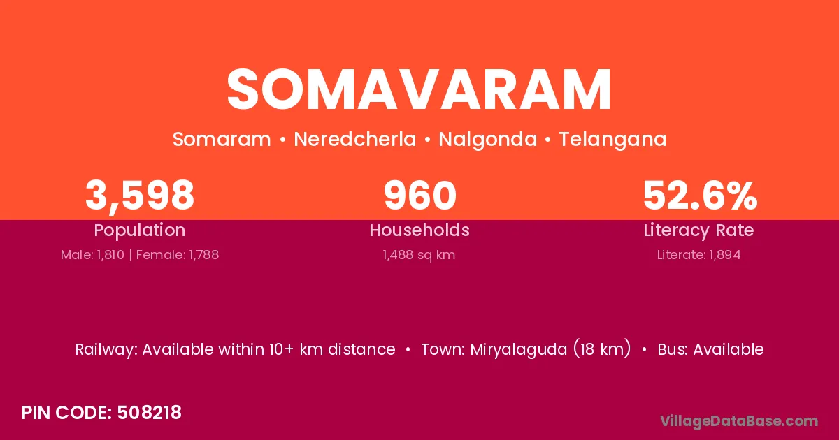 Nuzvid (42 km) is the nearest town to Somavaram village for major economic activities and is located approximately 42 km away.