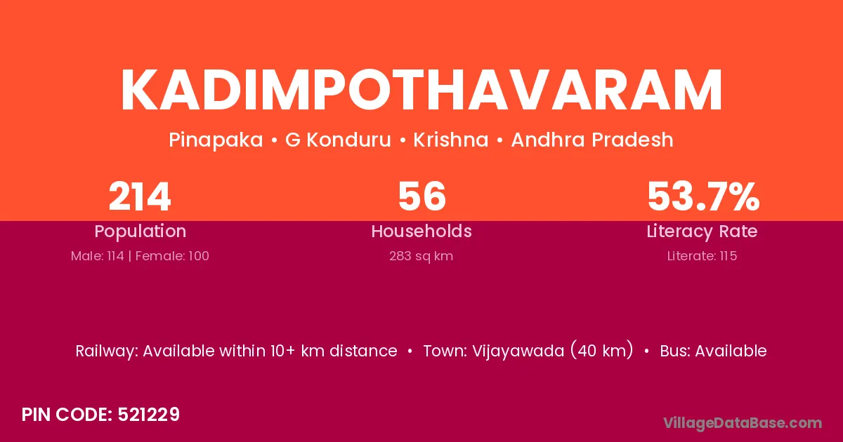Kadimpothavaram village has a total population of 214 people, of which 114 are males and 100 are females.