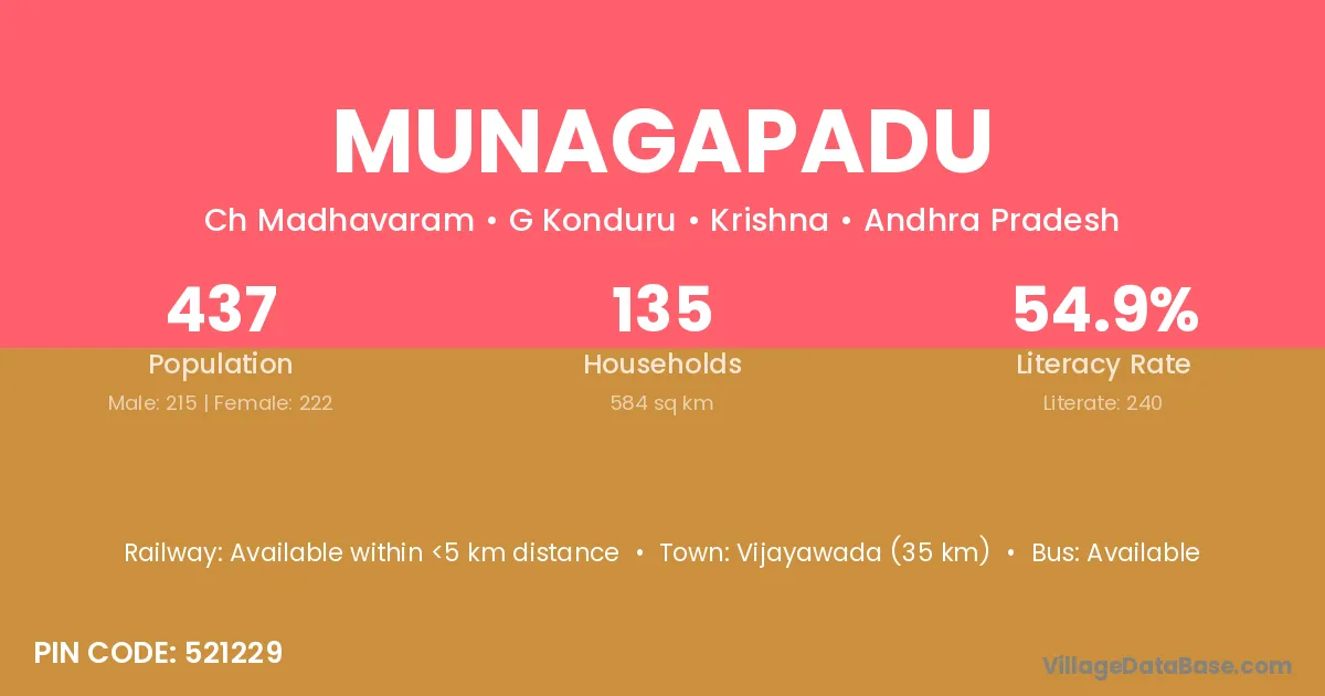 Vijayawada (35 km) is the nearest town to Munagapadu village for major economic activities and is located approximately 35 km away.