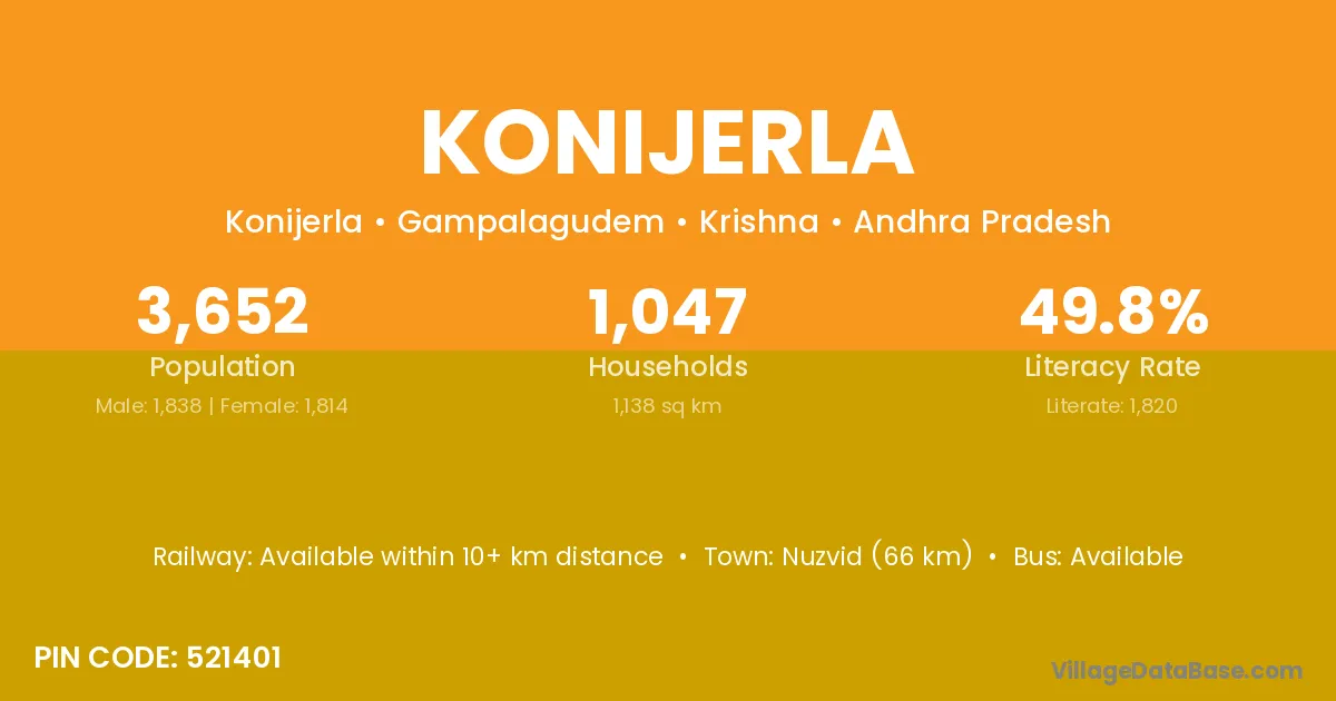 Nuzvid (66 km) is the nearest town to Konijerla village for major economic activities and is located approximately 66 km away.