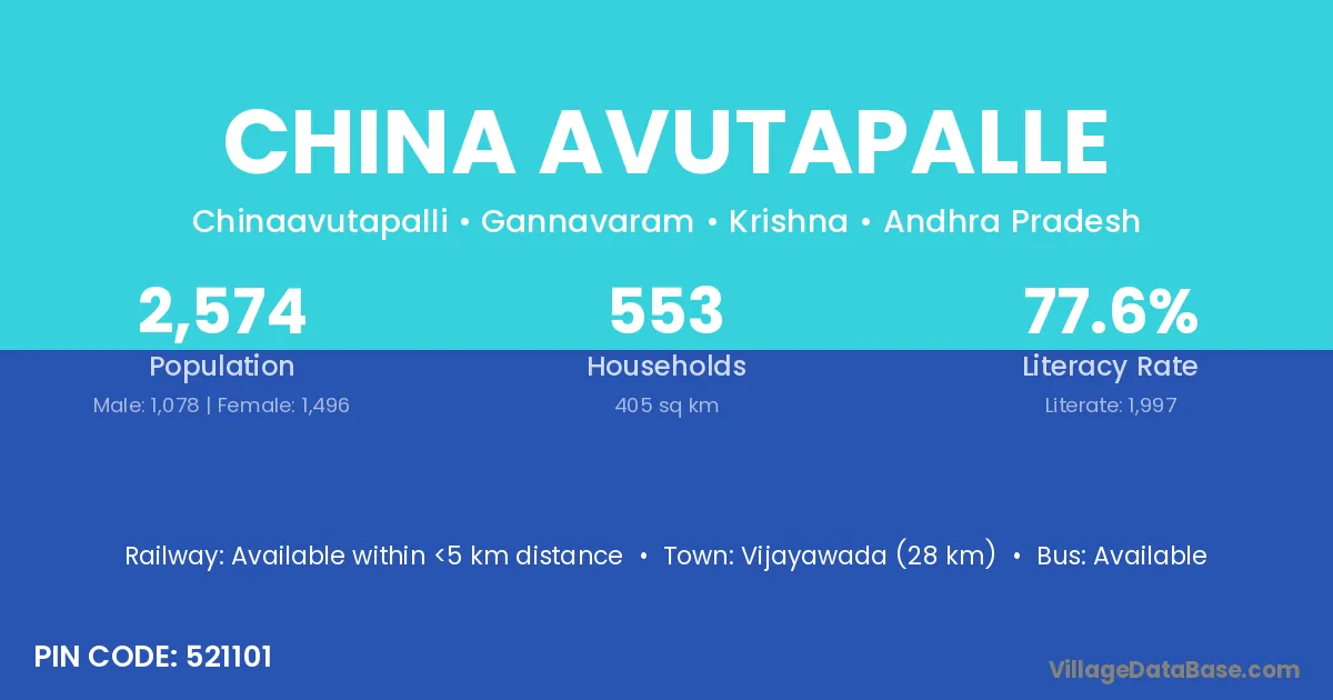 Vijayawada (28 km) is the nearest town to China Avutapalle village for major economic activities and is located approximately 28 km away.