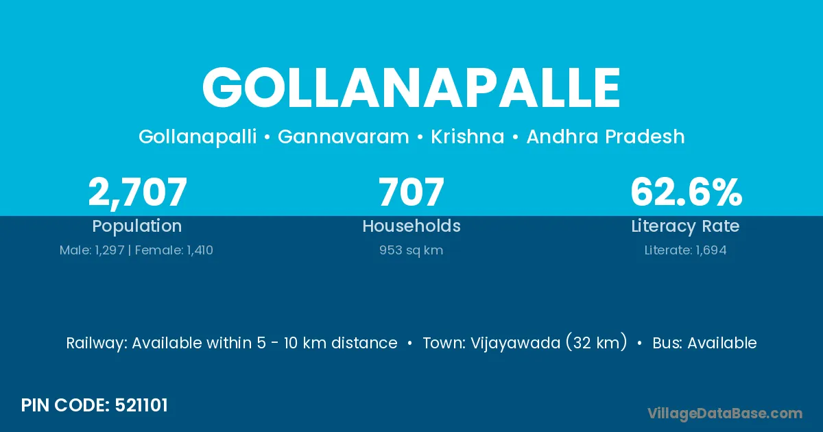 Vijayawada (32 km) is the nearest town to Gollanapalle village for major economic activities and is located approximately 32 km away.