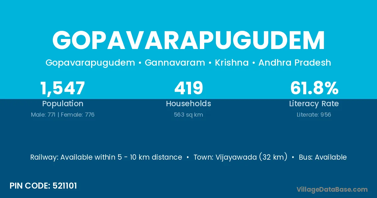 Vijayawada (32 km) is the nearest town to Gopavarapugudem village for major economic activities and is located approximately 32 km away.