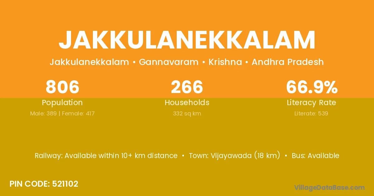 Jakkulanekkalam village has a total population of 806 people, of which 389 are males and 417 are females.