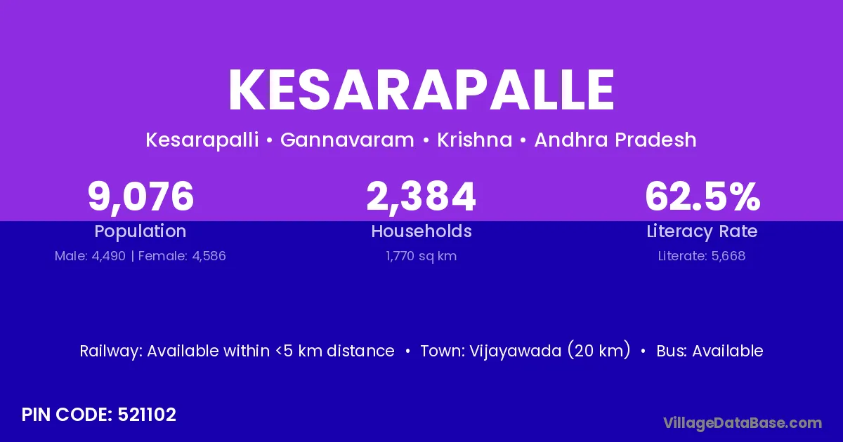 Vijayawada (20 km) is the nearest town to Kesarapalle village for major economic activities and is located approximately 20 km away.