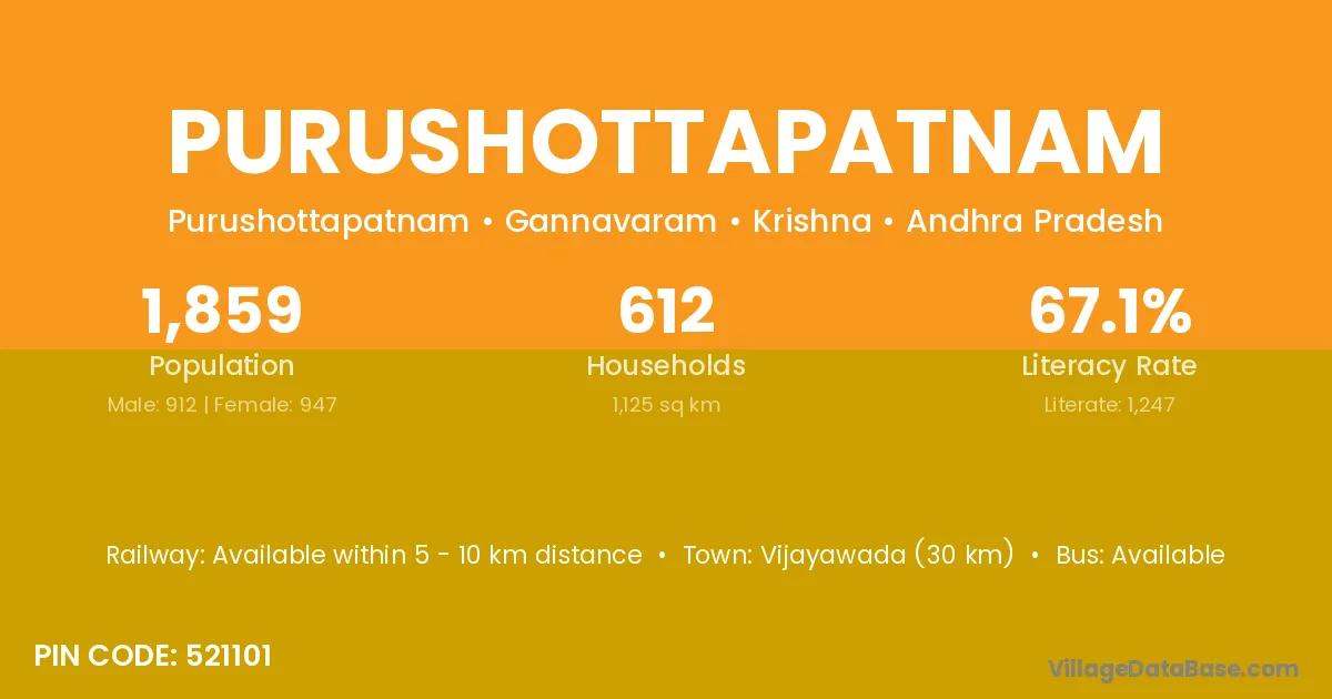Vijayawada (30 km) is the nearest town to Purushottapatnam village for major economic activities and is located approximately 30 km away.