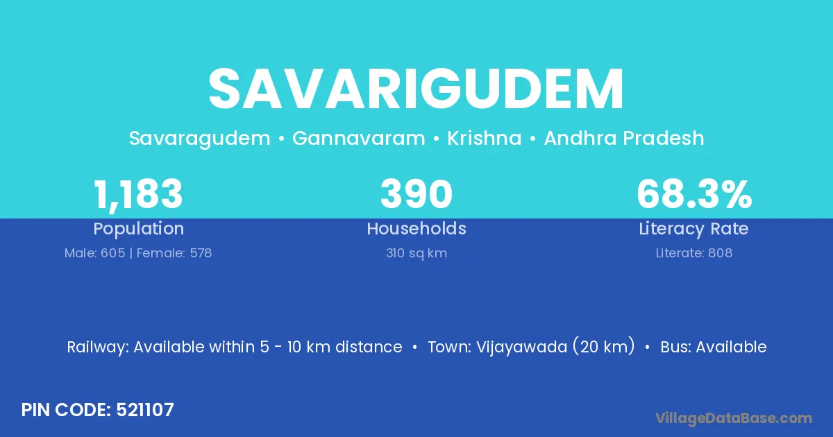 Vijayawada (20 km) is the nearest town to Savarigudem village for major economic activities and is located approximately 20 km away.