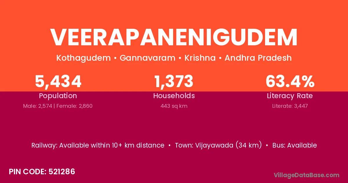 Veerapanenigudem village has a total population of 5,434 people, of which 2,574 are males and 2,860 are females.