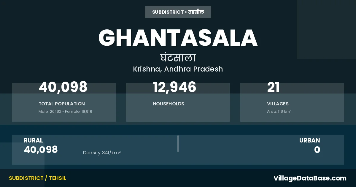 According to the 2011 census The total area of Ghantasala Mandal is 118 km², with a population of 40098 people. The population density is 341 inhabitants per square kilometre, and there are approximately 12946 houses in the sub district.