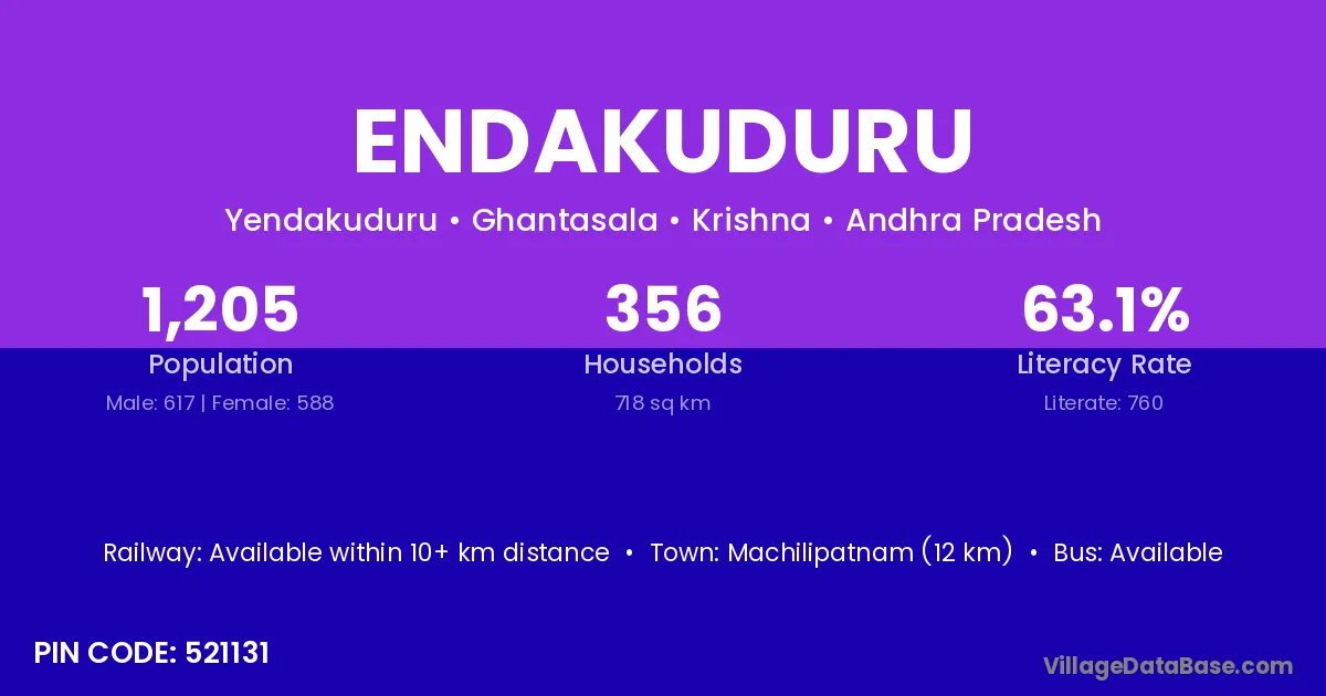 Machilipatnam (12 km) is the nearest town to Endakuduru village for major economic activities and is located approximately 12 km away.