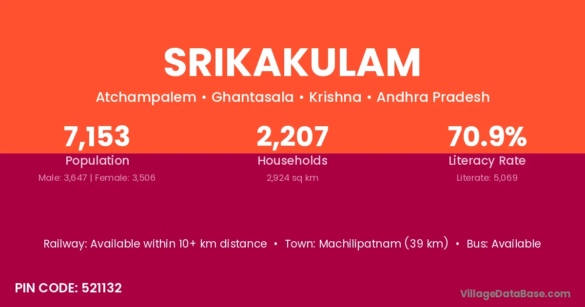 Srikakulam village has a total population of 7,153 people, of which 3,647 are males and 3,506 are females.