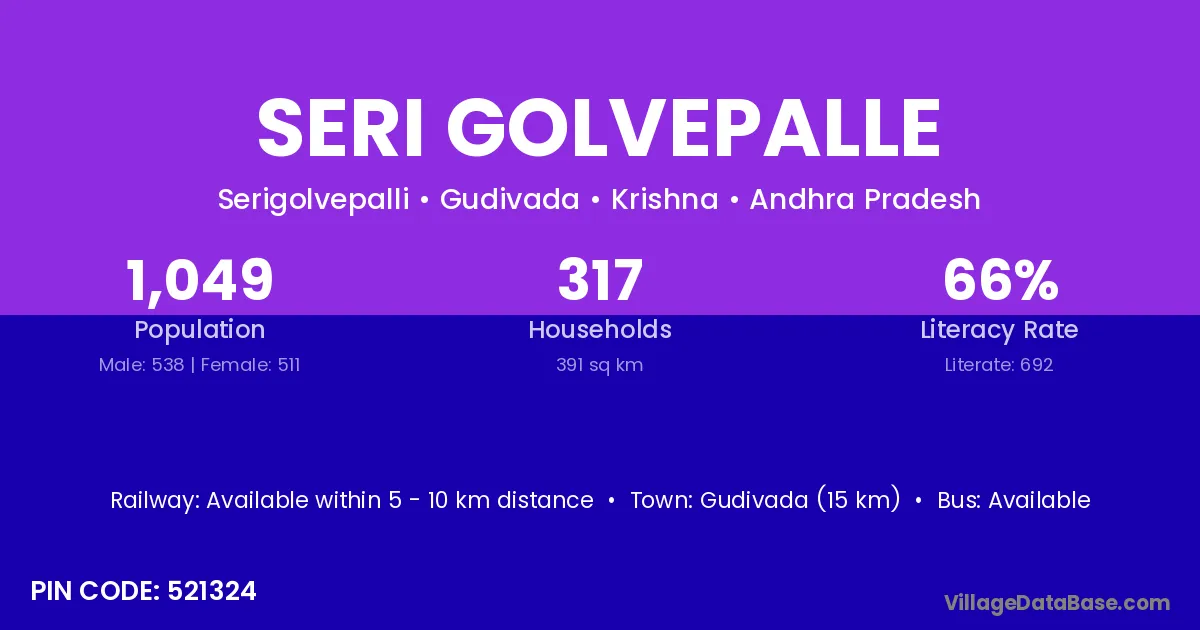 Gudivada (15 km) is the nearest town to Seri Golvepalle village for major economic activities and is located approximately 15 km away.