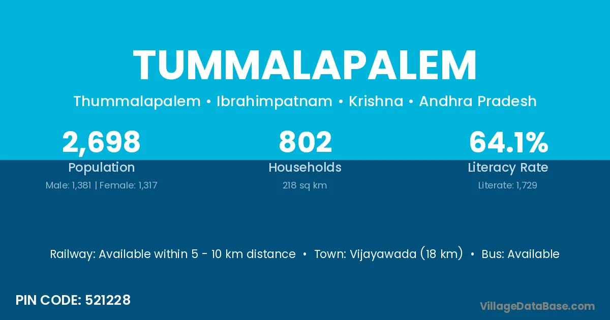 Vijayawada (18 km) is the nearest town to Tummalapalem village for major economic activities and is located approximately 18 km away.