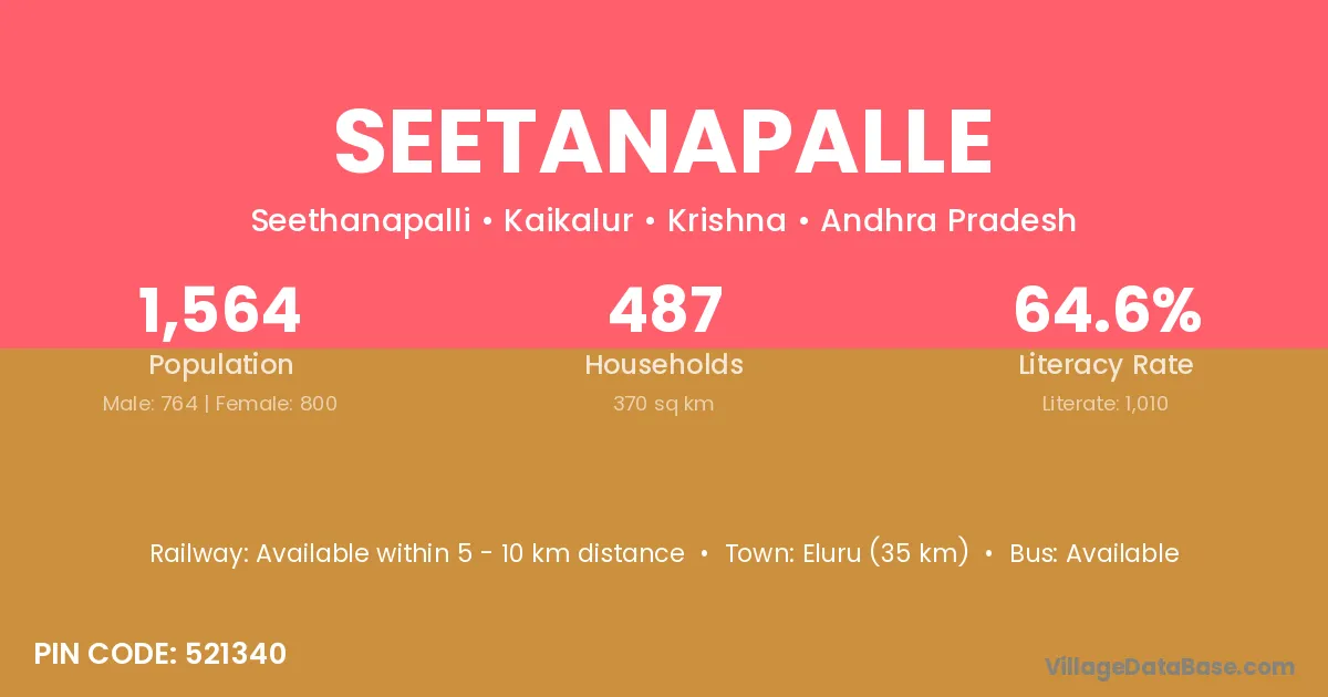 Seetanapalle village has a total population of 1,564 people, of which 764 are males and 800 are females.